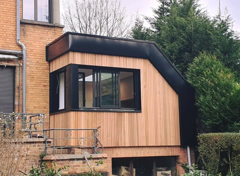 Belle cuisine en ossature bois, verrière sur une toiture associant un bac acier isolé et une étanchéité EPDM isolée, bardage en faux claire voie red-cedar et aluminium laqué. Une réalisation « Agence 31 » à Saint-André-lez-Lille.