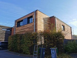 Une belle maison en ossature bois à parement traditionnel de marque DEWAELE, nécessitant un agrandissement que DEWAELE se refusait de faire. Qu’a cela ne tienne, les équipes DUVAL interviennent ! Elévation ossature bois, isolation en fibre de bois, étanchéité EPDM sur isolant, menuiseries aluminium Aliplast, et bardage clin en red cedar, étaient au programme. Maître … Lire la suite de Elévation sur un garage