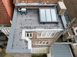 La terrasse en zinc et la verrière en polycarbonate ont été avantageusement remplacées par une membrane EPDM Firestone durable, posée sur un isolant PUR de 100 mm, et par une verrière moderne offrant luminosité et confort. Maître d’ouvrage : particulierMaître d’oeuvre : NC