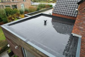 Membrane d’étanchéité EPDM RubbzeGard Firestone en pose mécanique sur un isolant fibre de bois, Steico Roof dry, 120 mm en 2 couches croisées. #Firestone #Steico #RoofDry #RubberGard