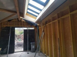 Extension de 40 m2 d’une maison individuelle, en ossature bois avant de recevoir couverture, verrière et bardages.Auparavant, DUVAL avait rénové la toiture du corps d’habitation principal, créé lucarne et plancher, velux, etc. Couverture, charpente, bardage, ossature bois, verrière avec ouvrant électrique.Les métiers exercés ici nous permettent de livrer des ouvrages clés en main a un … Lire la suite de Extension ossature bois, bac acier, verrière, bardage aluminium laqué